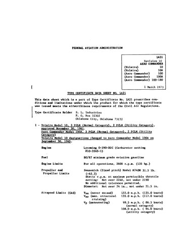 Aero Commander 100, 180 FAA Spec Sheet Aircraft Specification (part# 1A21)